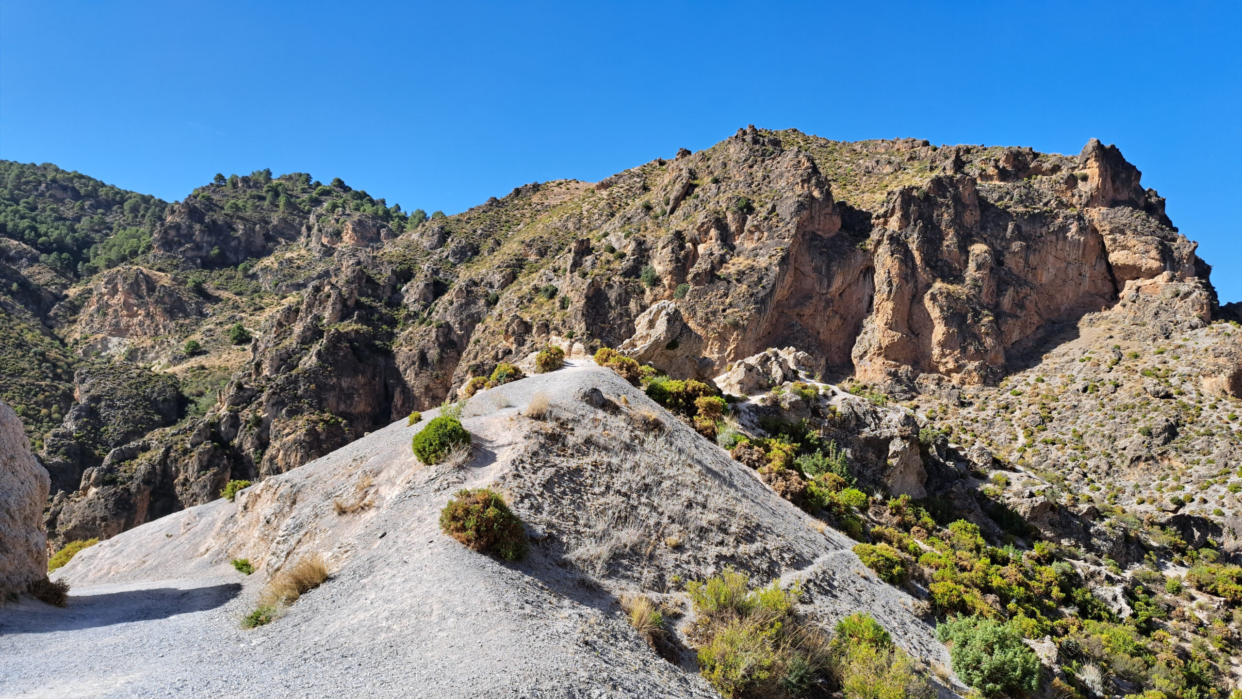 U rozcestníku u Fuente de las Chorreras odbočte na žlutou turistickou stezku vedoucí nahoru do kopců. Ta vás postupně zavede zpět do Monachilu. Cestou se ale budete moci kochat opravdu skvostnými pohledy do skalnaté horké krajiny.