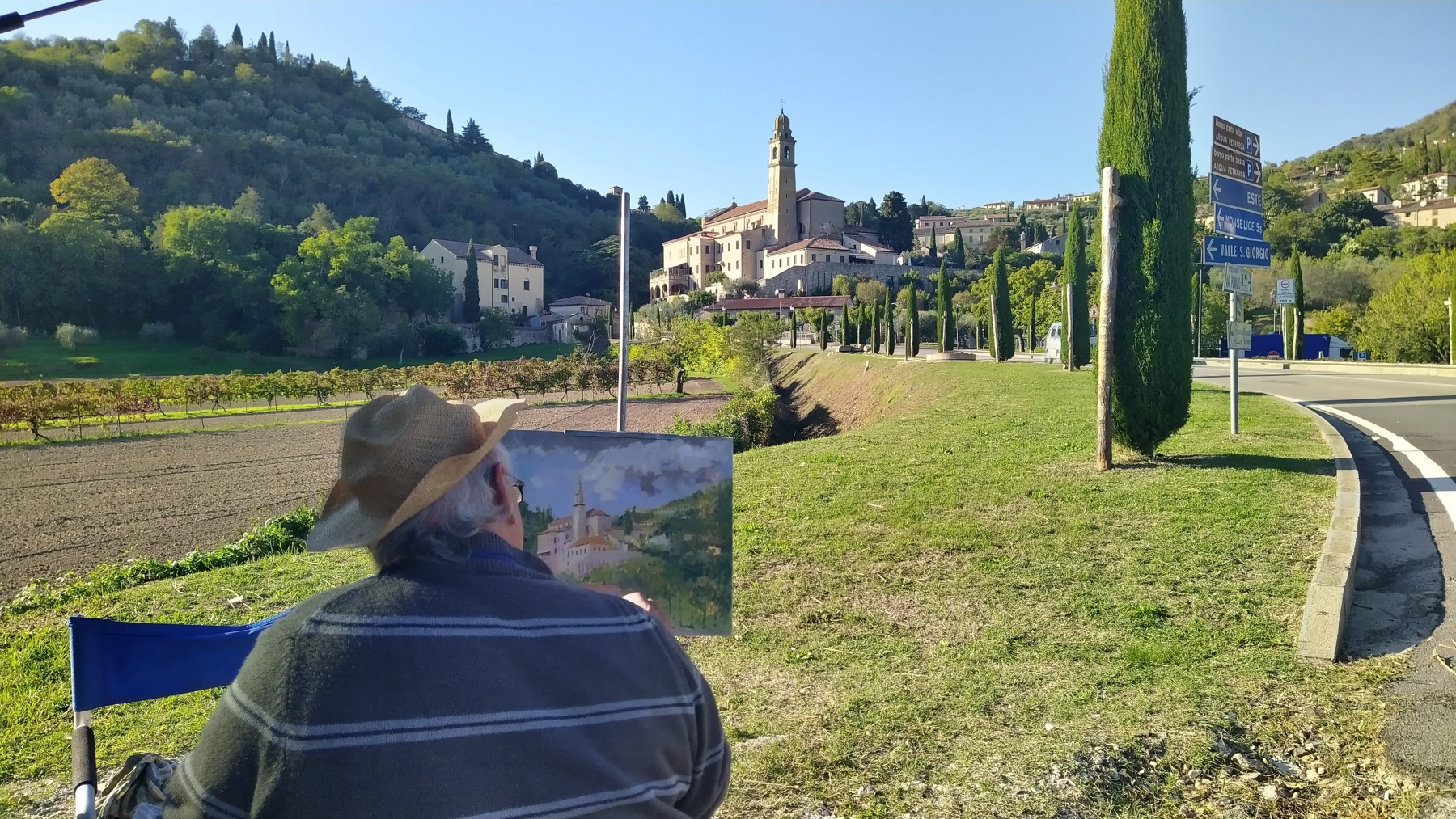 Ještě než jsme ale s Márou zamířili do Este, kde jsme si domluvili „pražské“ dostaveníčko, zajeli jsme do vesničky Arquà Petrarca. Cypřiše, nádherné počasí, zelené kopce a malebný kostelík se zvonicí přímo nad příjezdovou cestou. Spadly nám brady, rozšířily se nám zorničky a prsty jsme začali zběsile mačkat mobilní aplikaci fotoaparát.