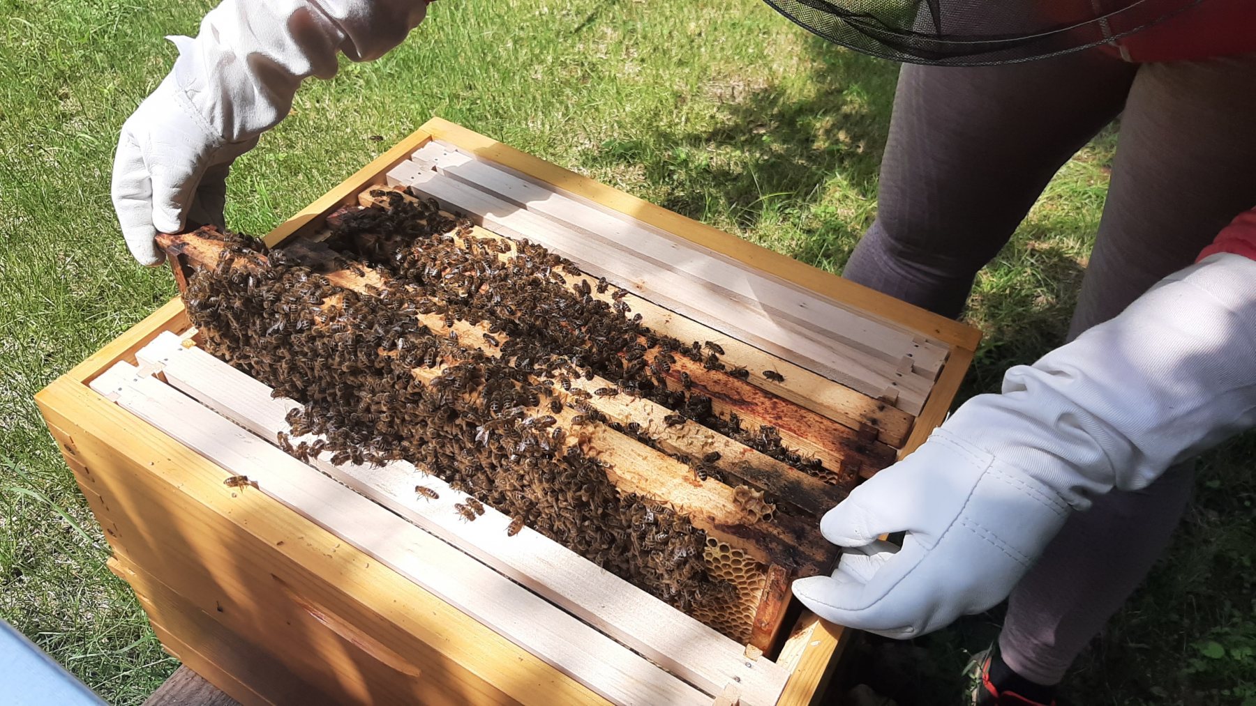 Včelí matka mezi dělnicemiUčíme se od sebe rozeznat zavíčkovaný plod od medu a trubčiny. Zkoumáme, jestli nemáme včelky napadené nějakou chorobou a sledujeme, jak mezi sebou včely komunikují. Při manipulaci se včelkami jsme stále poměrně pomalí a cítíme, že máme obrovský prostor pro zlepšení.