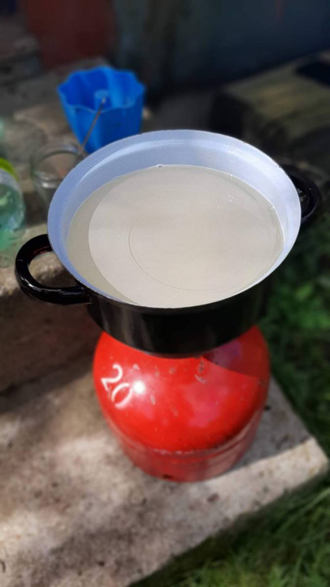 Šárka vaří cukerný roztokDo úlů jsme vložili stropní krmítka a na vařiči uvařili sladký hustý cukerný roztok. Své využití tak našly i 50 let staré cukrové homole, které měla ještě Markova babička ve špajzu. Časem jsme vyrobili i speciální kryt na krmítko. A začali jsme bojovat s dalšími přírodními padouchy. Mravenci. Mršky jedny, jakmile zjistili, že se v horním patře úlu pravidelně nachází sladký cukerný roztok, začali na úly dělat hromadné nájezdy. My s Markem jsme tak museli pravidelně úly odmravencovávat a spolu s dědou jsme vymýšleli strategie, jak mravencům bránit v jejich útocích. Nakonec se nám podařilo mravence od úlů odlákat a obě mladá včelstva jsme zakrmili 20 kg cukru (10 kg každému včelstvu).